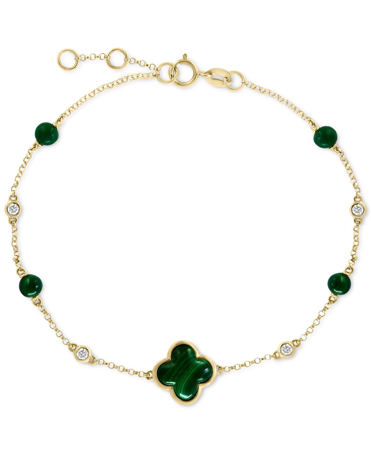 Clover and round-shaped malachite stones alternate with bezel-set diamonds on this enchanting gold bracelet from Effy. Style Keywords: Gold Metal,Circle,14 Kt Gold,Day Party,Diamond,Chain,Statement,Semi Precious Gemstones,Feminine,Thin,Set,Chain Link,Bead Embellishment,Single Strand