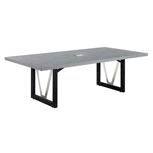 Embrace edgy industrial design for your photo-ready office with the District collection. Created for the private office or a bold work-from-home workspace, this series of casegoods embodies urban style with high-quality construction. This conference table features a scratch and stain-resistant laminate top with painted black solid-wood frame to ensure long-lasting durability. Metal accents include a V-shaped accents at the base and rectangular grommet covers. Table top is 2'' thick with beveled edges to create a miter corner appearance. Additional desking, storage, and reception pieces are available to round out your industrial-inspired workspace.Assembly required.