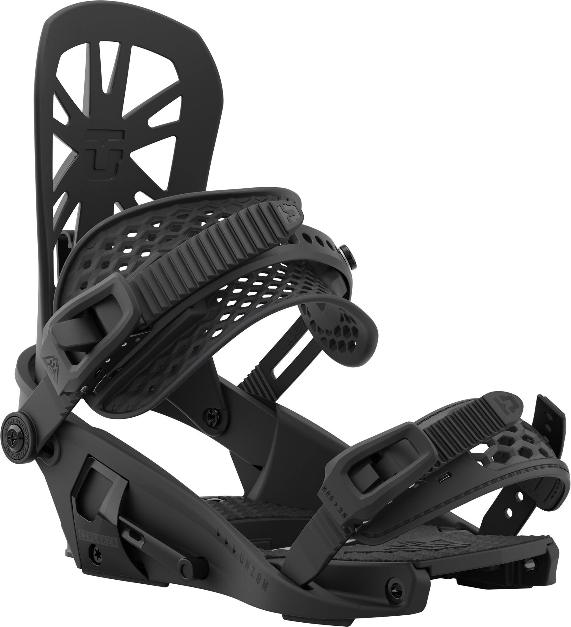 That means efficient movement on the skin track, followed buy poppy, jibby, surfy goodness on the downhill. Their lightweight and strong construction sacrifices nothing, so much so that Union includes an adapter for your solid. Go out into the backcountry knowing you have top notch hardwear, Union-tough materials, and a smooth feel in the steep and deep. Spring Loaded Pin System By combining the standard pin system with the Split System baseplate, Union increases the amount of connection between board and binding. Just one pin changes the mode and locks it into place. Ride Mode For riding, the binding slides onto the baseplate which rotates over the center of the board. The pin slides the through the middle of the baseplate for maximum connection. Exoframe 4.0 Ankle Strap Rapid response, trusted by professional snowboarders. Magnesium 3.0 Ratchets Union's proven bombproof ratchet system, Magnesium buckles are light, sleek, and durable on the mountain. EXP2 Duraflex ST The perfect balance of flex and response for all types of riding.