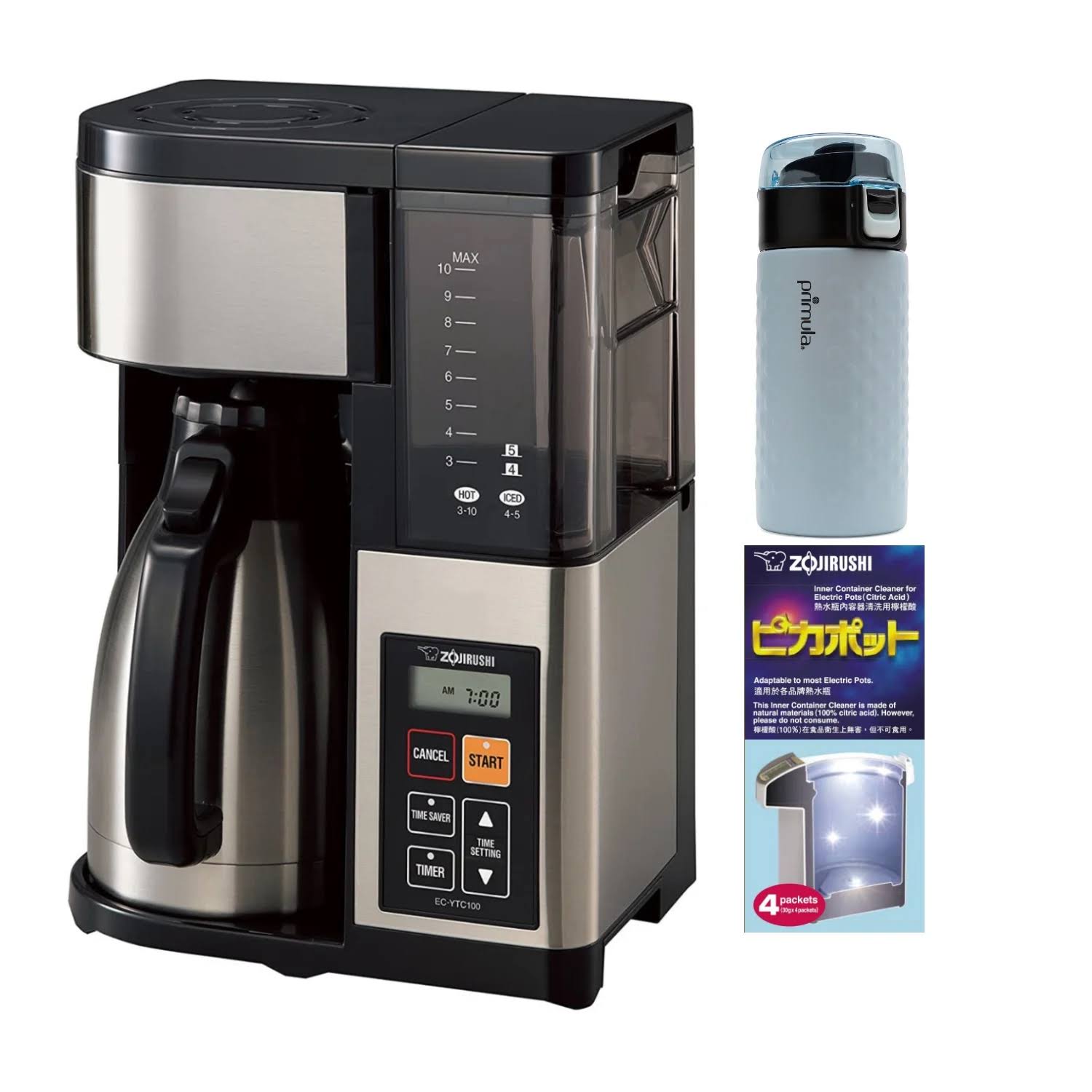 Zojirushi EC-YTC100XB 10-Cup Coffee Maker Brewing fresh, flavorful Coffee is easy with the fresh brew plus thermal carafe Zojirushi Coffee Maker EC-YTC100, which brews coffee at an optimal 200-degree-F high brewing temperature of up to 10 cups of excellent hot Coffee or enough concentrated brew for up to 5 cups of iced coffee. The stainless steel carafe is vacuum insulated keeps coffee hot for hours and the tapered design with thumb-activated pouring makes serving smooth and easy. The permanent stainless mesh Coffee filter is reusable and washable. 200-Degree-F High Prep Temperature Heats the water to the right temperature for making tasty coffee (when brewed in the Time Saver mode). Time-Saving Mode This optional mode offers faster hot coffee by reducing brewing time. Vacuum Insulated Stainless Steel Jug The Stainless Steel Jug keeps coffee hot for hours without the burnt taste caused by heating plates. Permanent Stainless Steel Mesh Coffee Filter The included permanent mesh filter is reusable and washable. Zojirushi CD-K03EJU Inner Container Cleaner for Electric Pots This Zojirushi Inner Container Cleaner can be used with most electric pots. The cleaner removes lime scale build-up on all Zojirushi electric water boilers and warmers. It is made from 100% citric acid, biodegradable as well as non-toxic when used as directed. Primula Hamilton 12-Ounce Double Wall Stainless Steel Tumbler The Hamilton stainless steel insulated tumbler is ideal for sipping your favorite hot or cold beverages on the go, with a wide enough opening to put ice cubes inside if desired. The double-walled, vacuum-sealed technology will keep your beverages hot or cold all day long, so you can enjoy your favorite beverages at the ideal temperature. The Hamilton also fits in standard cup holders, so you can place your tumbler in your car cup holder, gym equipment cup holder, and more. Vacuum Insulation To Keep Drinks Hot Or Cold The double-wall vacuum-sealed insulated design can keep drinks icy cold for up to 24 hours or hot for up to 8 hours. The wide mouth of the tumbler allows you to easily add ice cubes for cold drinks so you can enjoy iced drinks for hours. You can also add your favorite fruits or herbs to the bottle, allowing you to customize your drinks with your favorite flavors. Durably Constructed Premium Coffee Mug The double-wall stainless steel design keeps your drinks hot or cold without transferring the temperatures to your hands. Take your tumbler with you while hiking, biking, walking, going to the gym, or to work- anywhere you go, this travel mug can come with you! Leak-Proof Lid The screw-on, flip-top lid is leak-proof, so you can place this tumbler in a gym bag, purse, car cup holder, and more without worrying about your beverage leaking everywhere. The lid locks into place so you dont have to worry about it accidentally opening. Convenient To-Go Tumbler This tumbler fits in standard cup holders and has a carry loop to easily bring your favorite beverage with you anywhere you go. This tumbler easily fits in standard cup holders. Easy To Clean This tumbler is very easy to clean with any bottle brush because of the wide mouth top. Get in hard-to-reach areas in a cinch! Single Serve Machine Compatible This mug easily fits under most single-serve coffee makers, making it easy to make and take your coffee, tea, and more on the go! Made With The Earth In Mind The Hamilton travel mug is made without BPA and is constructed